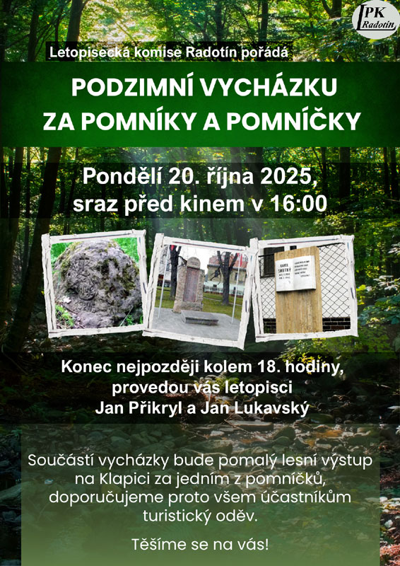 Součástí vycházky bude pomalý lesní výstup na Klapici za jedním z pomníčků, doporučujeme proto všem účastníkům turistický oděv.